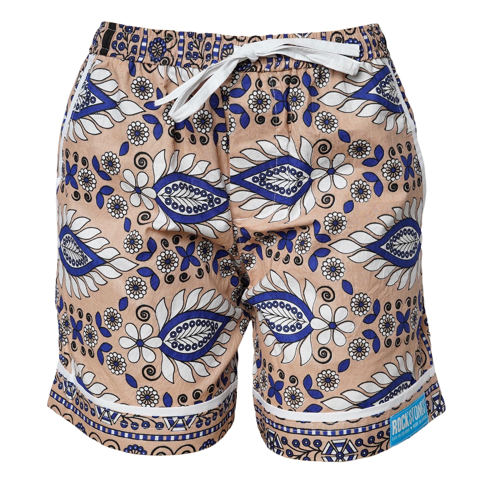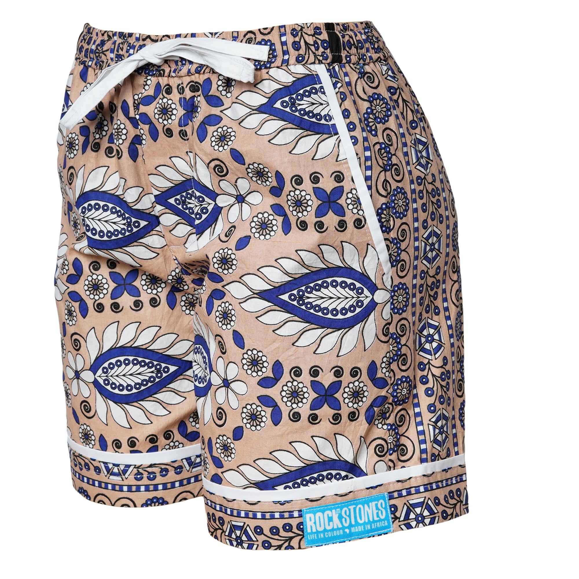 100% cotton Kanga fabric, elasticated waist with cotton drawstring for extra support.  Two slanted side pockets - we love them and know you will too!